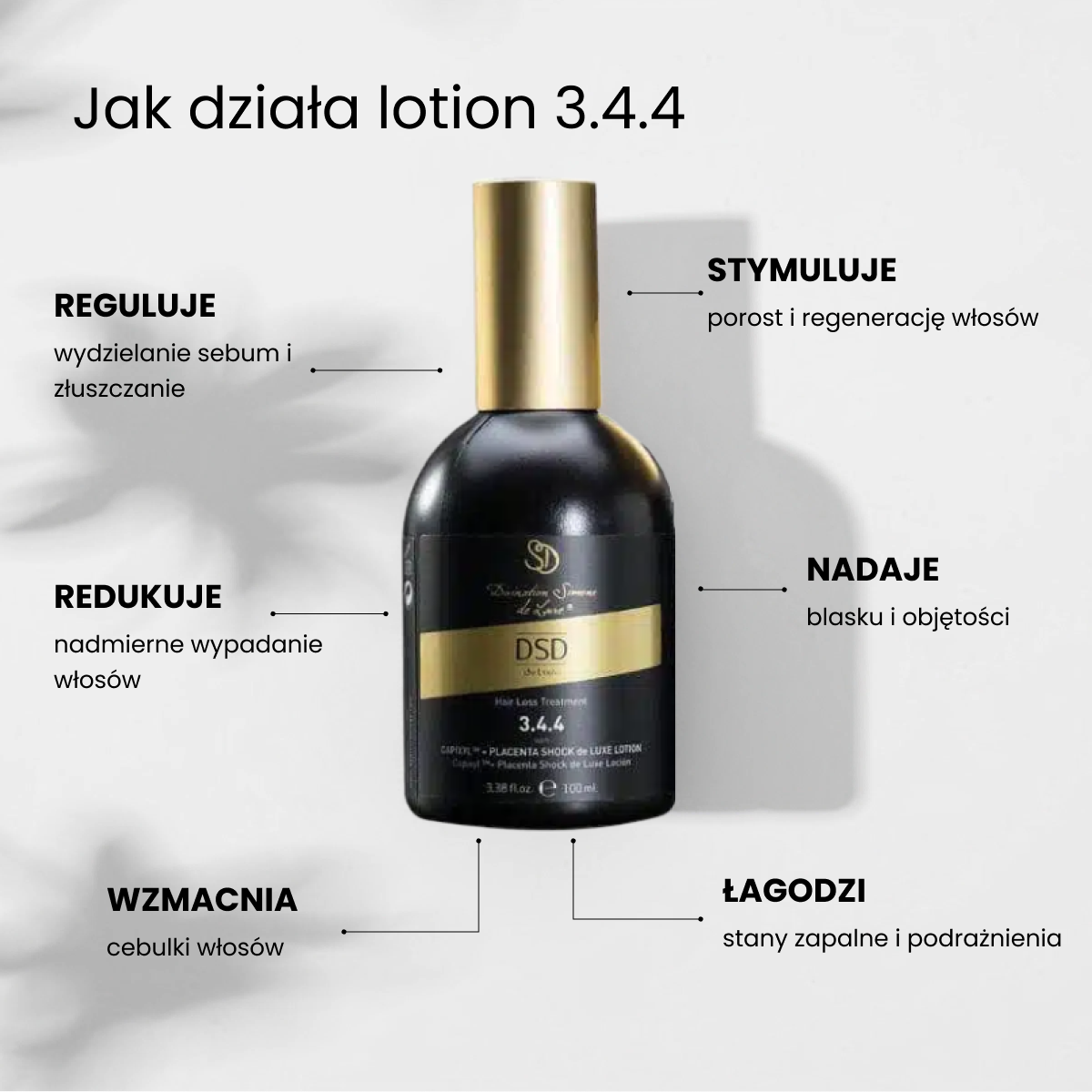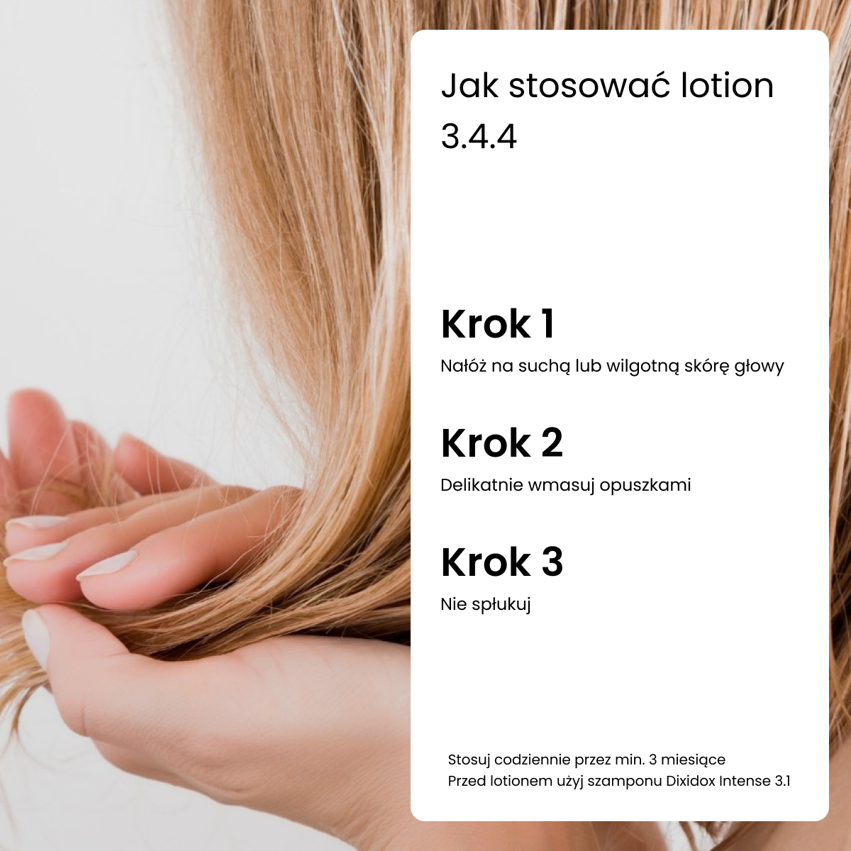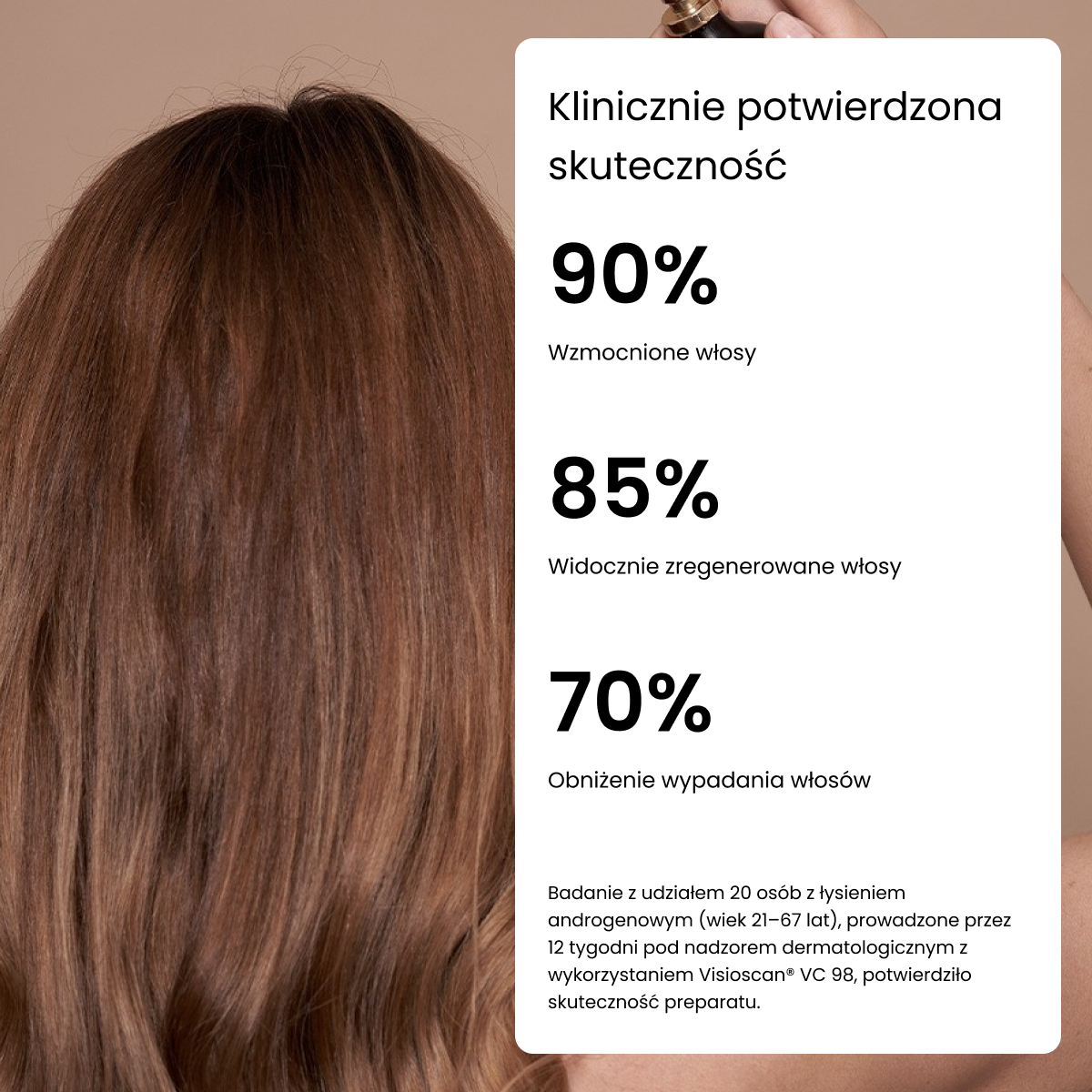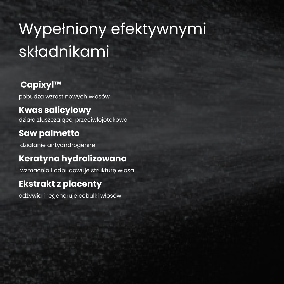 Hamuje wypadanie włosów. Działa przeciwłojotokowo. Wspomaga odrastanie włosów w przypadku łysienia androgenowego.