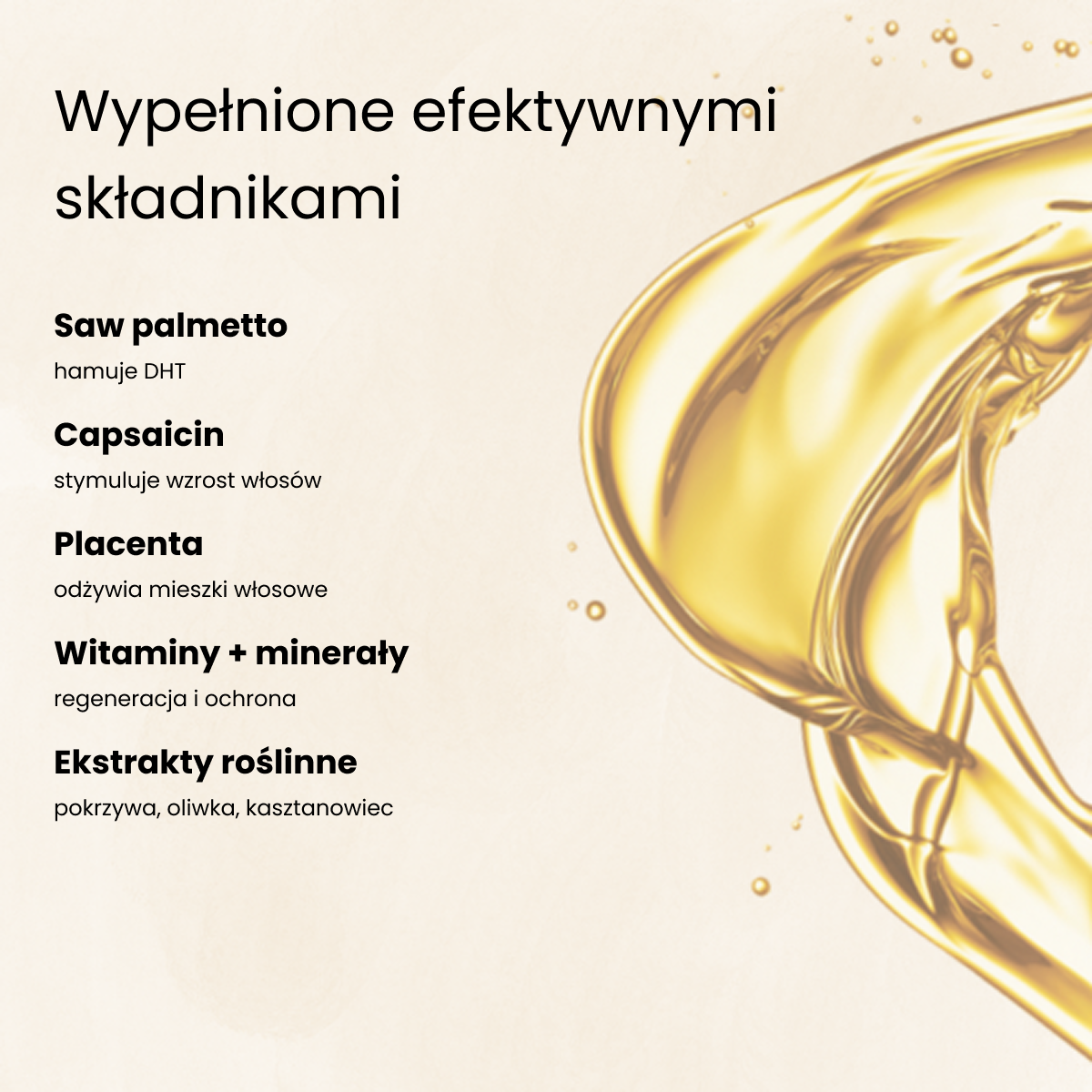 Hamuje telogenowe wypadanie włosów, działa przeciwzapalnie. Wspomaga odrost włosów.
